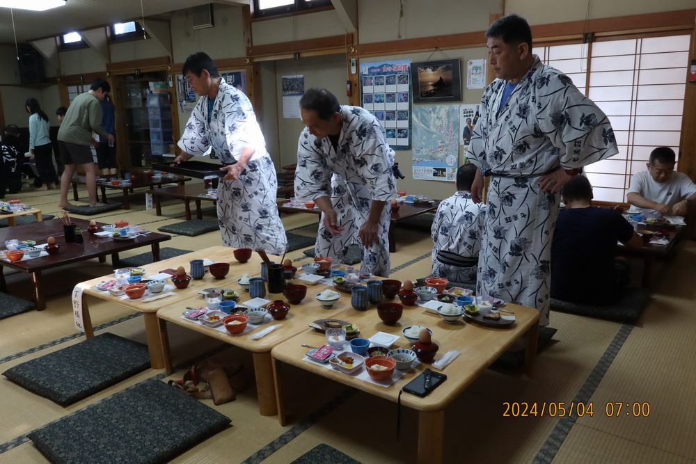 朝風呂を済ませて7時からの朝食。給仕は各自で。