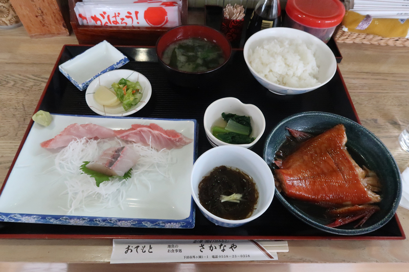 R414・R136で下田へ。道の駅内にある「さかなや」で金目鯛の刺身と煮付け。