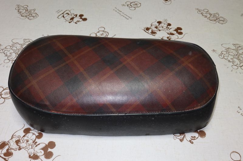 オリジナルシートはへたるので外して保管し、代わりに田中商会のチェック柄を装着。